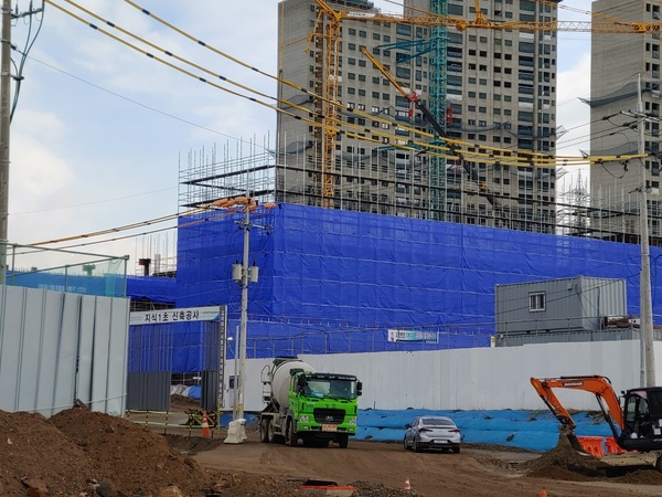 과천 지정타 5단지와 6단지 사이에 신축되는 지식1초등학교 공사장으로 10일 레미콘 차량이 분주하게 드나들고 있다. 이슈게이트