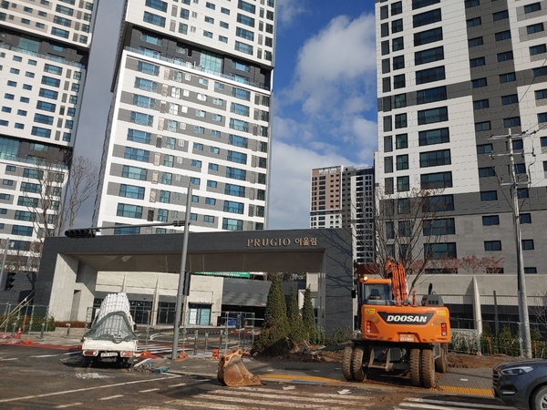 입주를 5일 앞둔 10일 이 아파트단지 정문 앞은 차도와 보도 포장, 신호등 설치 등 공사가 한창이었다.
