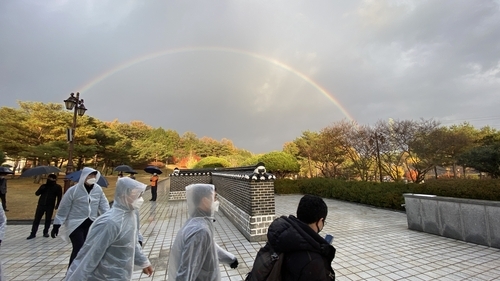 윤석열 국민의힘 후보가 10일 광주 5·18 민주묘지를 참배한 뒤 떠난 직후 무지개가 떠올라 여러 해석을 낳았다. 연합뉴스