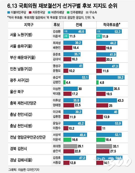 인천 남동갑에선 맹성규 민주당 후보가 41% 지지율로 1위를 기록했다. 윤형모 한국당 후보가 10.2%로 2위다. 광주 서구갑은 송갑석 민주당 후보가 과반이 넘는 지지율(53.1%)을 지키고 있다. 김명진 민주평화당 후보가 2윈데 4.4%로 격차가 크다. 충북 제천단양에서도 민주당 이후삼 후보가 35.8%로 1위다. 엄태영 한국당 후보는 22.5%로 2위를 지키고 있다.