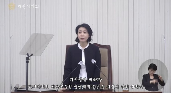 고금란 과천시의회 의장이 9일 제266회 2차정례회 본회의를 진행하고 있다. 시의회인터넷방송캡처