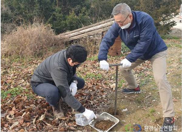환경단체 관계자들이 지난 11월 29일 과천지구에서 2019년 1월~6월에 실시한 전략환경영향평가 토양 측정지점을 참조해 총 9개 지점에 대한 사료를 채취하고 있다. 사진= (사)환경실천연합회