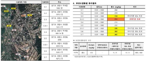 서 오염함량 기준 70% 이상인 292-365mg/kg가 검출돼 대상지 9개소 중 5개소가 토양오염 우려 지역으로 확인됐다고 10일 밝혔다.