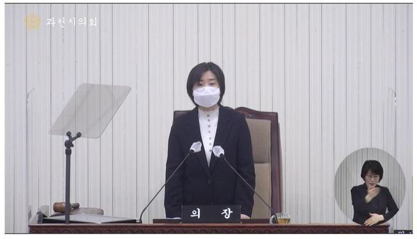 제갈임주 의장은 지난해 5월24일 시회의에서 불신임된 뒤 법원 판결을 거쳐 8일 개회된 과천시의회 268회 임시회 의사봉을 잡았다. (사진)