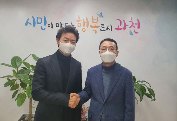 LG에너지솔루션 이방수 경영지원센터장이 10일 과천시장실에서 김종천 시장을 만나 악수하고 있다. 김종천페이스북