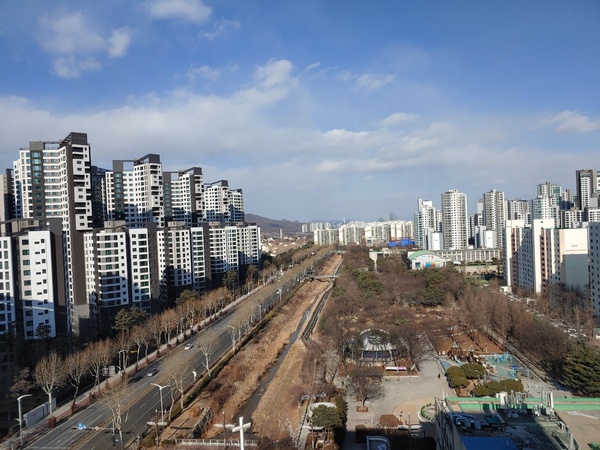 과천시 양재천을 사이에 두고 아파트가 늘어서 있다. 이슈게이트