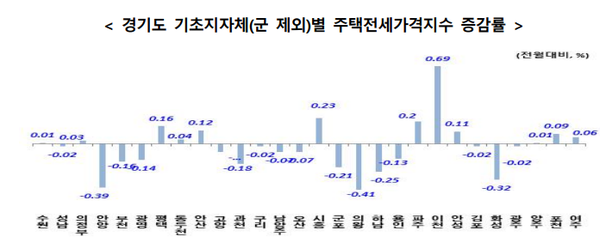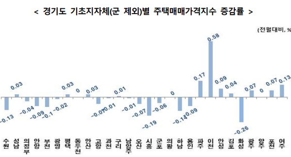 과천시(-0.18%) 의왕시(-0.41%), 안양시(-0.39%), 화성시(-0.32%)를 포함한 16개 시에서 하락했다.