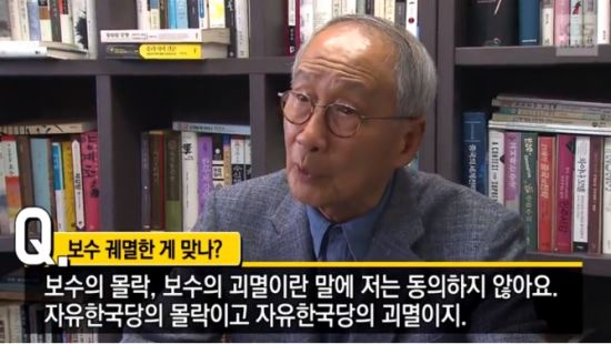 윤여준 전 환경부 장관이 6·13 지방선거에 대해 “보수의 궤멸이란 말에는 동의하지 않는다”“자유한국당의 몰락일뿐”이라고 말했다. 윤 전 장관은 KBS 뉴스와의 인터뷰를 통해 “정말로 보수적인 가치를 존중하는 사람들은 한국당을 보수라고 생각하지 않는다”고 했다.