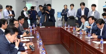 같은 시간 재선의원 모임을 하던 박덕흠 의원 등 13명의 재선의원은 김 권한대행이 의원들과 논의 없이 중앙당 해체를 선언한 데 반발해 의원총회 소집을 요구했다.