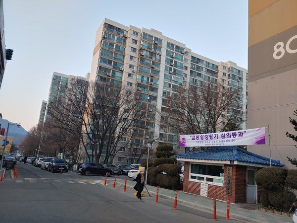 과천 8단지 재건축 조합 교통영향평가 심의가 통과됐다는 현수막이 8단지 아파트단지 내에 8일 걸려 있다. 이슈게이트
