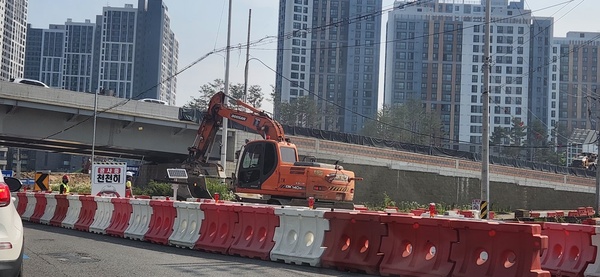 차로 2개가 임시 폐쇄된 과천지정타 47번 우회도로 진입지점 공사 현장. 이슈게이트