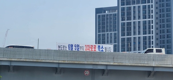 6일 오전 47번국도 우회도로 초입지점인 신갈현삼거리 고가교에 “현 도로는 6월5일부터 3차로로 축소됩니다”라는 현수막이 내걸려 있다.