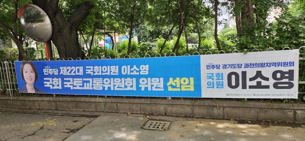 이소영 의원은 21대 하반기에 이어 22대 상반기 국토위원으로 지난 13일 재선임되자 과천시내 일원에 자축하는 현수막을 내걸었다.