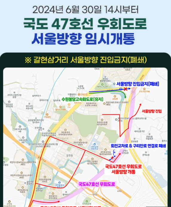 국도47호선 서울방향 임시 개통과 함께 달라지는 사항은 △서울 진입 방법 변경 △갈현삼거리(과천정보과학도서관 옆) 서울방향 폐쇄 △과천대로 차로 축소(1~2개 차로) △제비울교차로 서울방향, 신구리안로 개통 등이다.