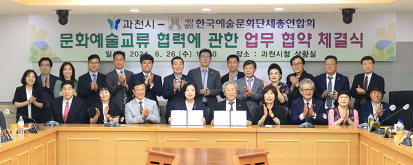 과천시는 26일 (사)한국예술문화단체총연합회(이하 한국예총)와 ‘문화예술교류 협력에 관한 업무협약(MOU)’을 체결했다.