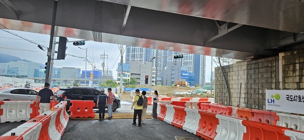 30일 과천 신갈현삼거리에서 47번 우회도로로 들어가는 차량을 신계용 과천시장과 과천시청 국과장들, 과천시의회 및 LH 관계자들이 지켜보고 있다. 이슈게이트