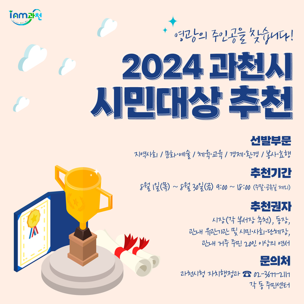 과천시가 지역사회 발전에 헌신·봉사해 온 시민을 발굴하기 위해 ‘시민대상’ 후보자를 이달 30일까지 추천받는다.