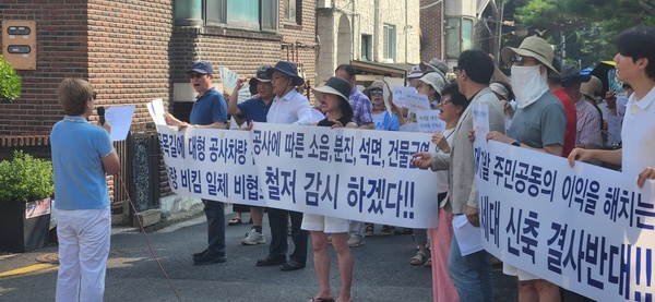 항의시위에 나선 주민들은 “재개발 예정 지구에 투기용 주택 신축을 반대한다”며 “공사 차량 골목 진입 시 주민 협조는 일체 없을 것이고, 공사 자재 도로 적치 발견 즉시 시청에 고발할 것이며, 공사 중 위법행위를 24시간 주민들이 감시하겠다”고 목소리를 높였다.