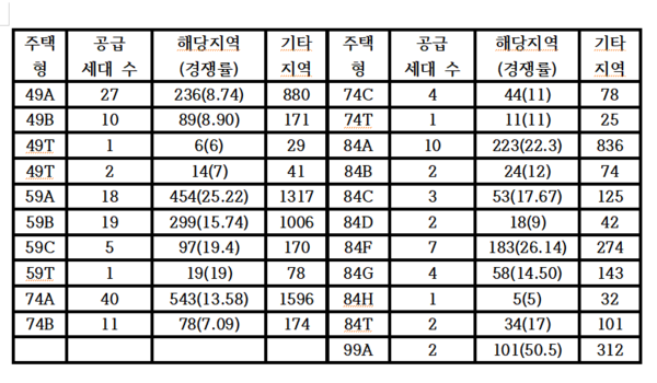 해당지역 경쟁률이 가장 낮은 평형은 84H로 1세대 모집에 5명이 청약해 5대1이다.