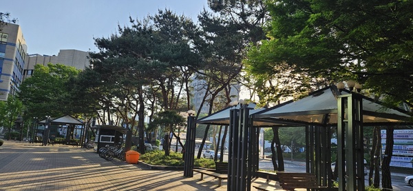 소나무와 휴식공간 등 현재 과천시민회관 시계탑 광장 모습. 이슈게이트