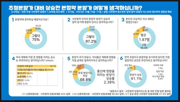 27일 과천주암지구 사전청약 연합회에 따르면 주암지구 C1, C2블록 사전청약 당첨자 설문조사에서 참여자는 1천6명(682세대)이었다면서, 분양가 상승이 청약 포기와 출산계획에 영향을 미친다는 반응을 보였다고 밝혔다.