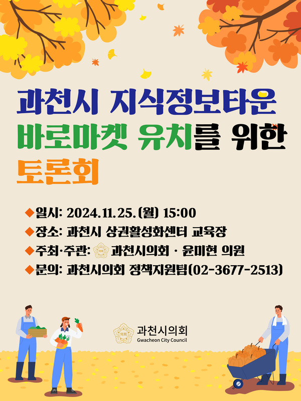 과천시의회는 25일 오후 3시 윤미현 의원 주최로 과천시 상권활성화센터(과천대로7가길 20, 205호)에서 ‘과천지식정보타운 바로마켓 유치를 위한 토론회’를 개최한다.