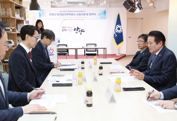 시는 이날 오전 11시 청사 3층 접견실에서 최대호 안양시장, 강오순 공사 경기남부지역본부장 등 관계자 6명이 참석한 가운데 ‘경기 안양 주거재생혁신지구 사업시행 및 위・수탁 협약식’을 열었다.