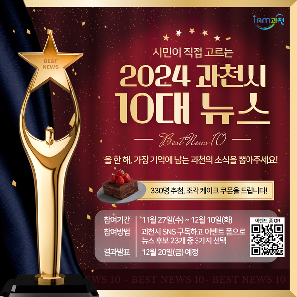 과천시는 27일부터 내달 10일까지 ‘2024년 과천시 10대 뉴스’ 선정을 위한 온라인 투표를 진행한다.