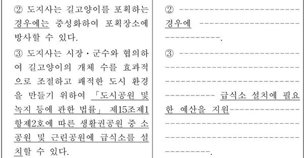 이 조례는 ‘도지사는 시장 또는 군수와 협의해 길고양이 개체 수를 효과적으로 조절하는 차원에서 ‘도시공원 및 녹지 등에 관한 법률’ 제15조 제1항 제2호에 따른 생활권공원 중 소공원 및 근린공원에 급식소를 설치할 수 있다’는 조항을 신설, 소규모 근린공원에 기초자치단체가 직접 길고양이 급식소를 설치할 법적 근거를 마련했다.