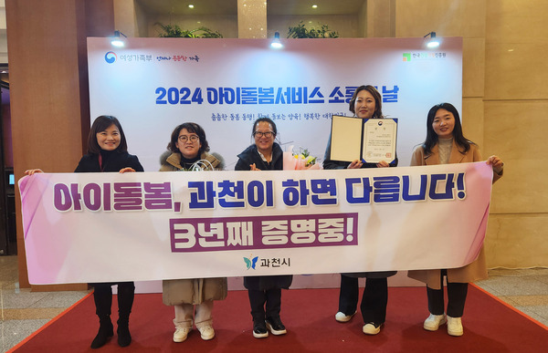 과천시 아이돌봄서비스 위탁운영 기관인 ‘과천시가족센터’(이하 가족센터)가 여성가족부 주관 ‘아이돌봄서비스 제공기관 평가’에서 3년 연속 우수기관으로 선정되며, 여성가족부장관상을 받았다. 시상식은 5일 서울 종로구 HW컨벤션센터에서 열렸다.
