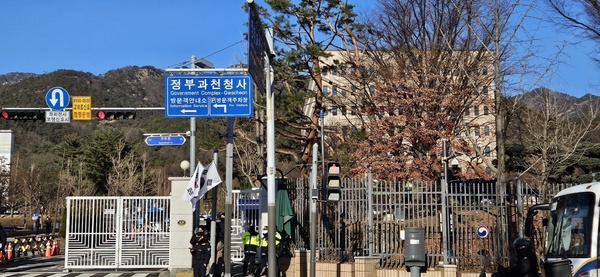 윤 대통령이 조사를 받기 위해 도착하기 한 시간 여 전부터 공수처가 위치한 정부과천청사 주변은 경찰 기동대 등 경찰병력이 배치돼 철통같은 경비태세로 돌입했다.