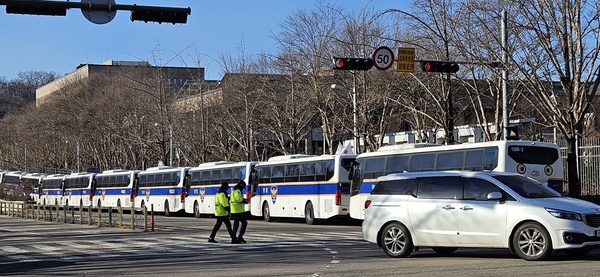 윤 대통령 공수처 도착에 앞서 이날 오전 10시쯤 경찰은 정부과천청사 앞 청사로와 청사 담장을 따라 경찰차 40~50대를 동원, 버스차벽을 만들었다.