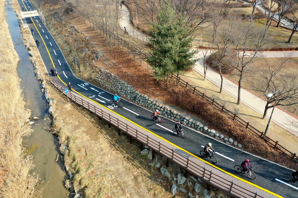 사람들이 양재천을 따라 자전거를 타고 있다. 과천시 자료사진