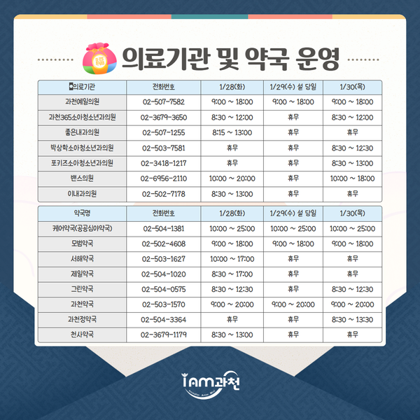 설 연휴 동안 당직 의료기관, 휴일 지킴이 약국, 마을버스와 시내버스 운행 정보 등 관련된 자세한 정보는 과천시청 누리집에서 확인할 수 있다.