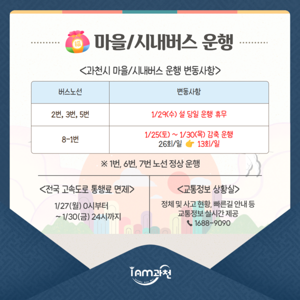 다만, 2번, 3번, 5번 버스는 설 당일(1월 29일) 운행을 중단하며, 8-1번 버스는 감축 운행된다.