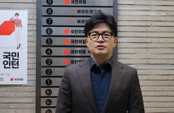 윤석열 대통령이 비상계엄을 선포한 지난해 12월3일 밤 한동훈 당시 국민의힘 대표가 당사에서 "계엄반대"입장을 밝히고 있다. 한동훈 페이스북