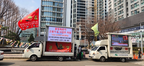 트럭에는 민주노총 전국건설노동조합 부산울산경남지역본부, 한국노총 한국타워크레인조종사노동조합이 쓰여져 있다.