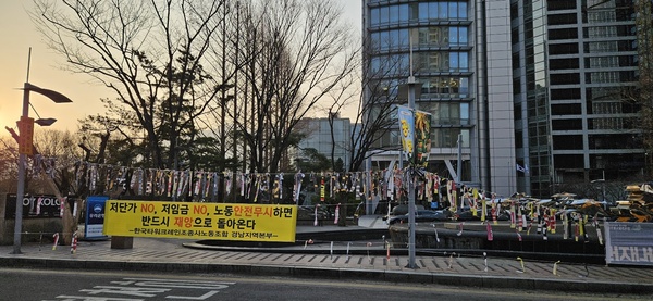 11일 코오롱 사옥 동쪽과 남쪽 펜스에는 플래카드가 내 걸리고 울긋불긋한 조각 천들이 펜스 주변 줄에 매달린 채 을씨년스럽게 바람에 날리고 있었다.