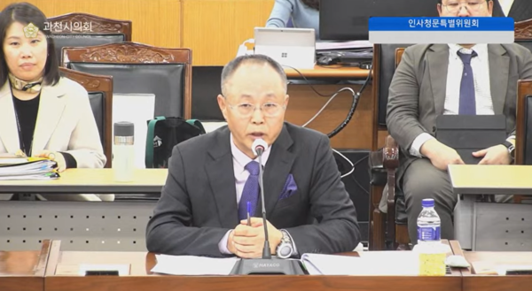 최형오 과천시 문화재단 대표후보자가 12일 과천시의회 인사청문회에서 답변하고 있다. 과천시의회인터넷방송캡처=이슈게이트