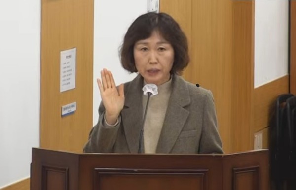13일 과천청소년재단 대표이사 인사청문회에서 박영미 후보자가 선서를 하고 있다. 과천시의회인터넷방송캡처=이슈게이트