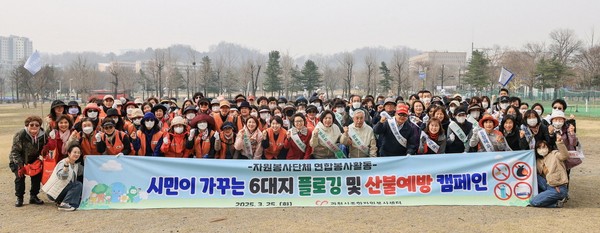 과천시는 25일, 자원봉사자로 참여한 시민 100명과 함께 정부과천청사 유휴지(6대지)에서 플로깅(조깅하며 쓰레기를 줍는 활동)을 하고, 관악산 입구에서 등산객을 대상으로 산불 예방 캠페인을 진행했다.