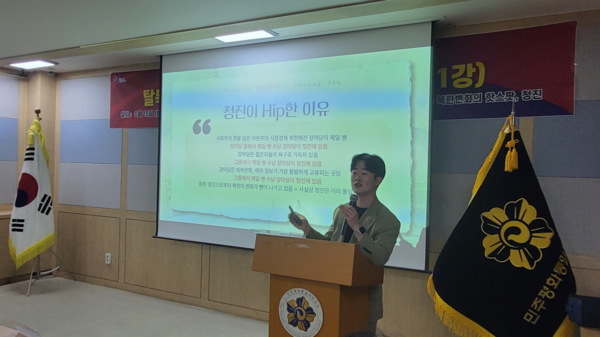 주일룡 강사가 북한 청진시에 대해 강연하고 있다.