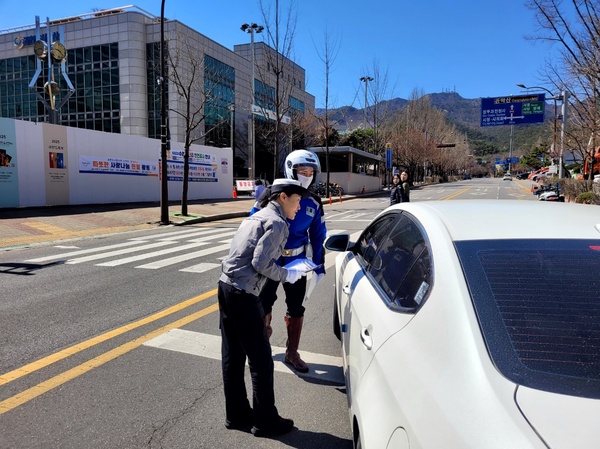 과천경찰서는 28일 소방서삼거리에서 우회전 위반차량을 집중단속했다. 과천서