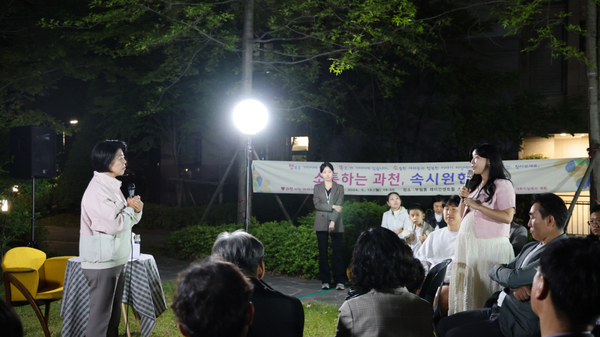 지난해 5월 과천시민간담회에서 신계용과천시장이 임신부의 질의를 받고 있다. 과천시