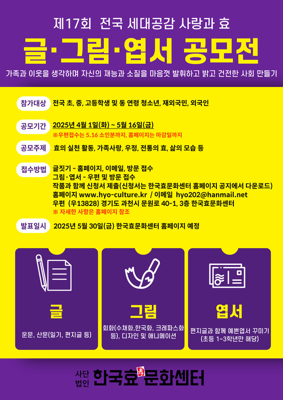 사랑과 효를 주제로 한 제17회 전국 청소년 그림, 글짓기, 엽서 공모전이 열린다.