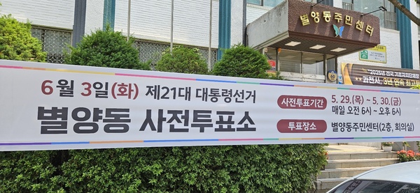 별양동사전투표소에 투표시간을 알리는 현수막이 내걸려 있다. 이슈게이트