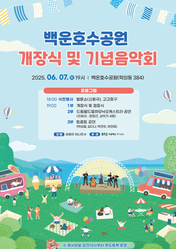 7일(토) 오후 7시 의왕시 학의동 384번지에 위치한 백운호수공원에서‘백운호수공원 개장식 및 기념 음악회’가 열린다. 의왕백운PFV가 개최한다.