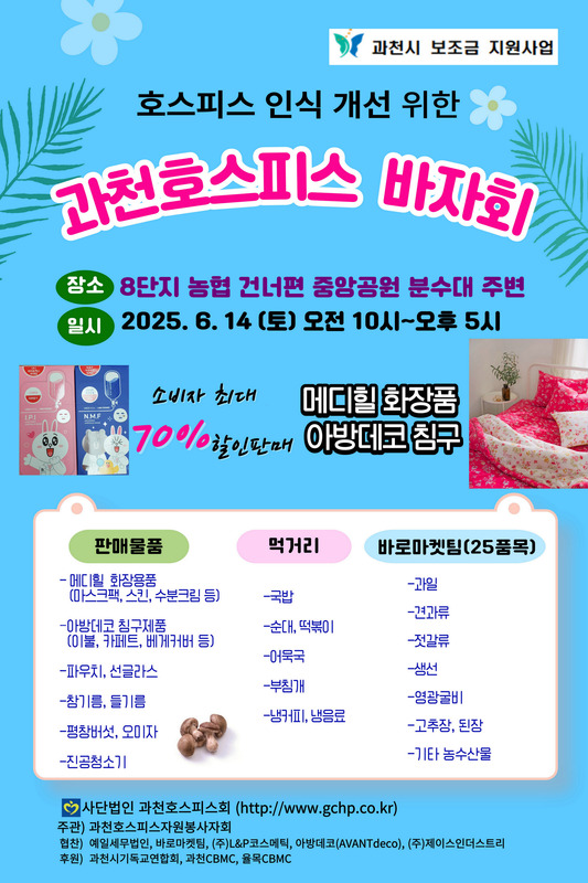 또한 과천호스피스회 자원봉사자들이 정성껏 준비한 먹거리 코너도 함께 운영돼, 방문객들에게 풍성한 즐길 거리를 제공할 예정이다.