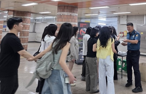 과천경찰서 관계자가 14일 대공원역에서 휴대용 약물탐지 키트 등을 배부하고 있다. 과천경찰서