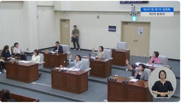 과천환경사업소 민관대책위 감사청구 안건에 대한 25일 과천시의회 표결에서 찬성자가 손을 들고 있다. 사진=과천시의회인터넷방송캡처